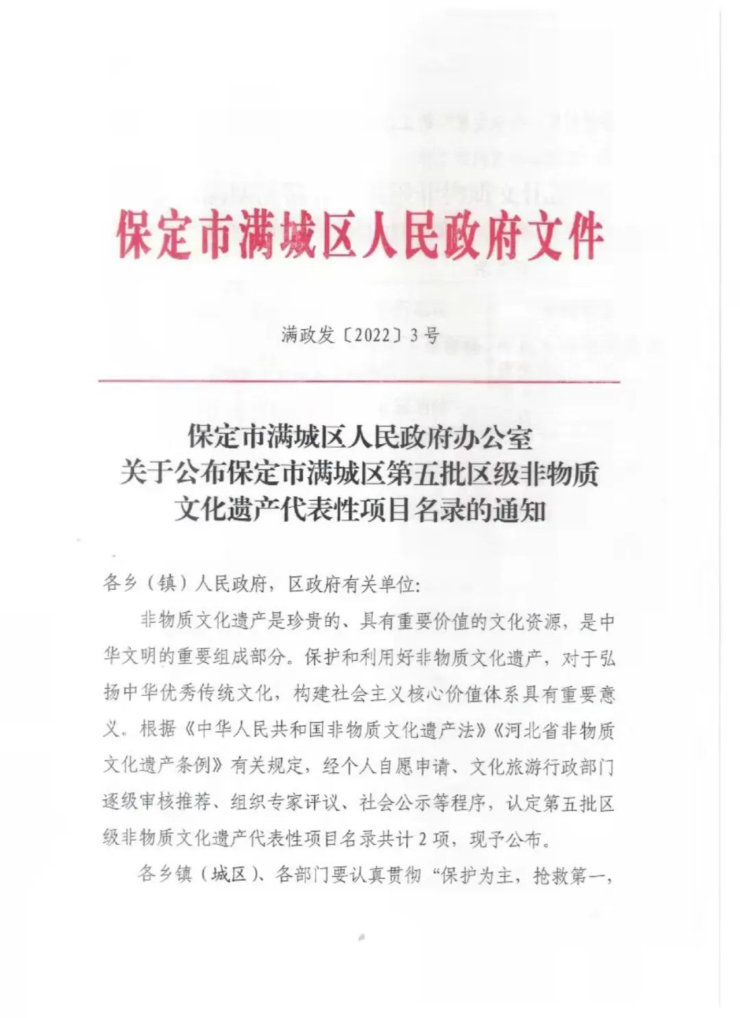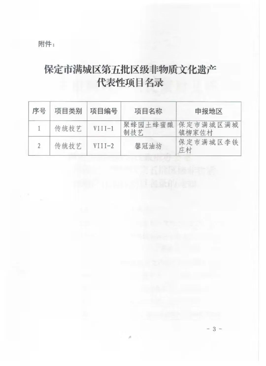 根據《中華人民共和國非物質(zhì)文化遺產(chǎn)法》《河北省非物質(zhì)文化遺產(chǎn)條例》有關(guān)規定,經(jīng)個(gè)人自愿申請、文化旅游行政部門(mén)逐級審核推薦、組織專(zhuān)家評議、社會(huì )公示等程序,認定第五批滿(mǎn)城區非物質(zhì)文化遺產(chǎn)代表項目的有“馨冠油坊”、“聚豐園土蜂蜜釀制技藝”。
