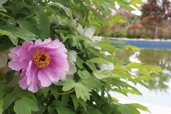 牡丹三兩朵,映入池塘間;