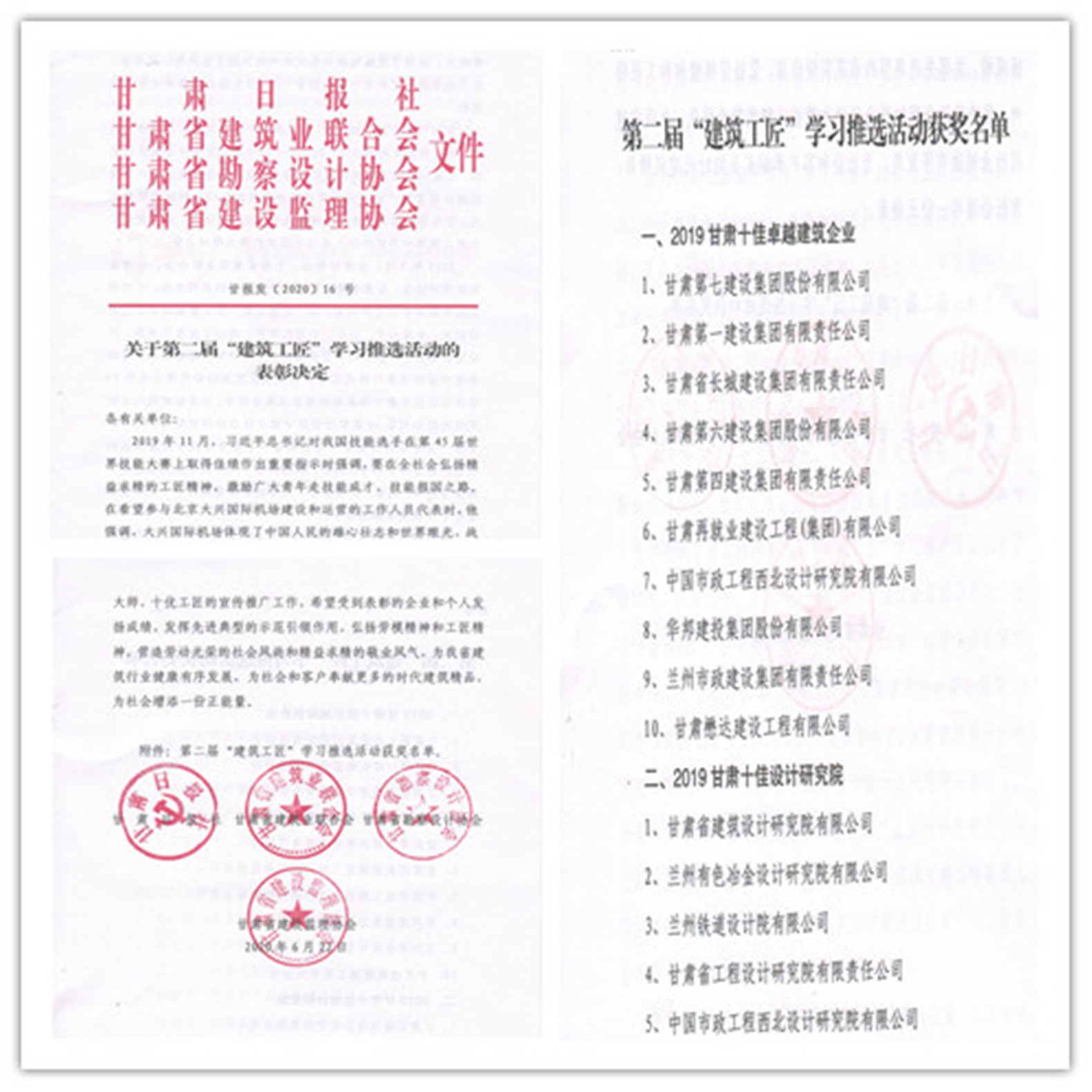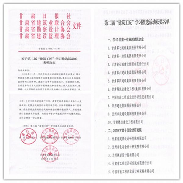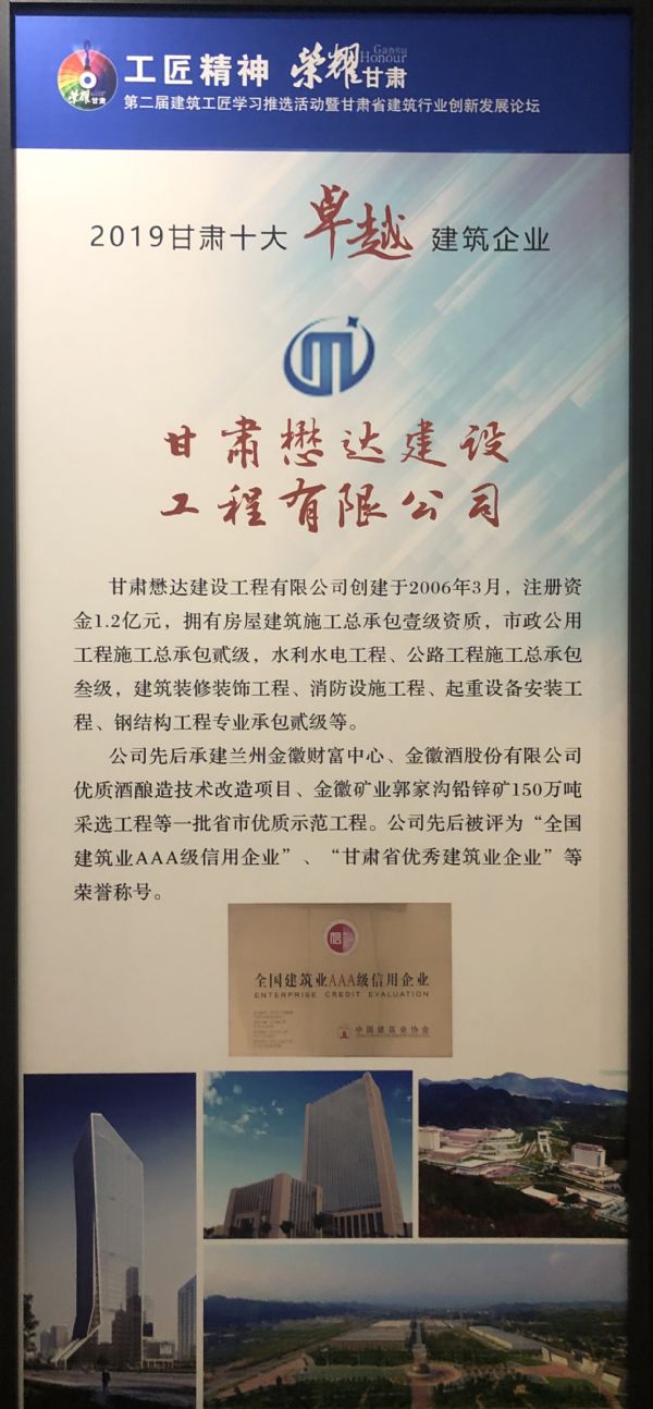 公司榮膺“2019甘肅十佳卓越建筑企業(yè)”榮譽稱號