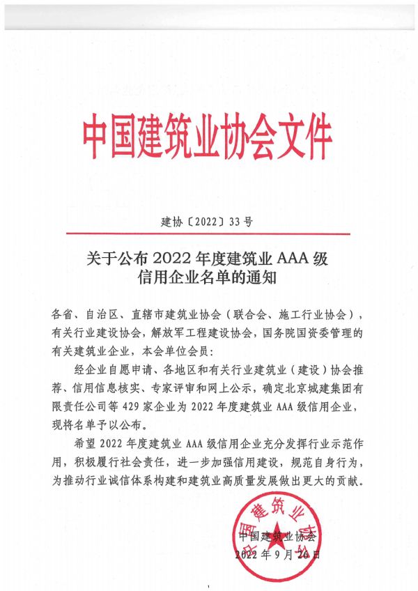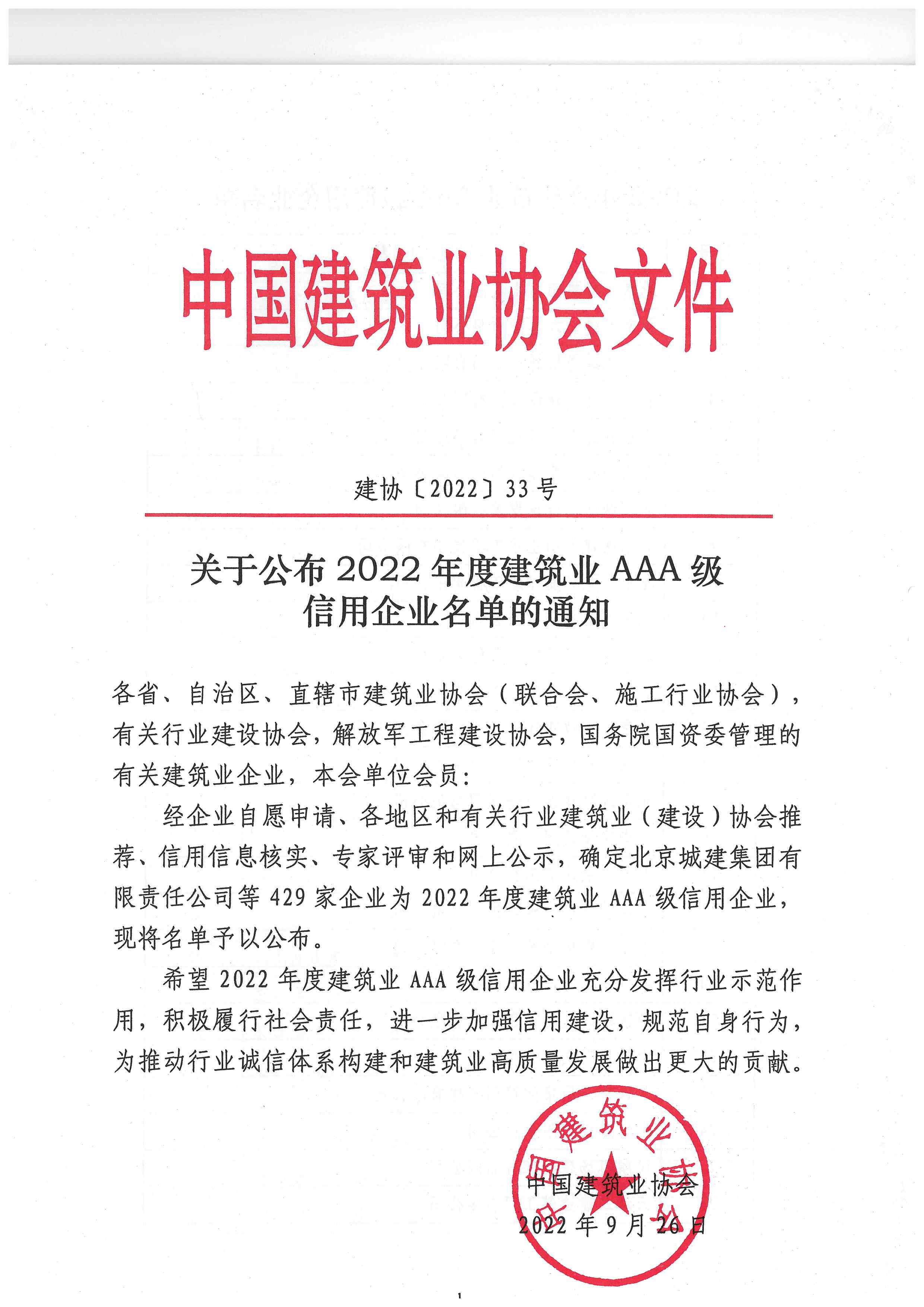 近日,從中國(guó)建筑業(yè)協(xié)會(huì)傳來(lái)捷報(bào),公司獲評(píng)2022年度“建筑業(yè)AAA級(jí)信用企業(yè)”。
