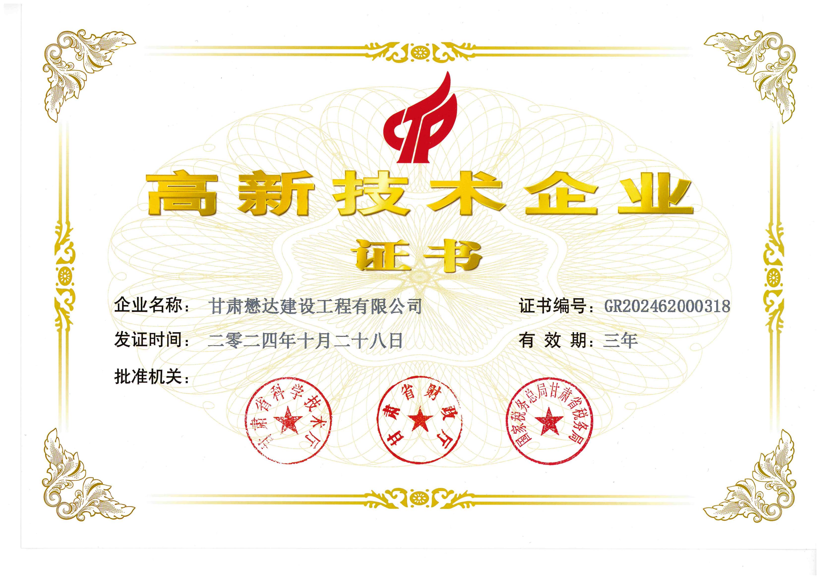 近日,根據《高新技術企業(yè)認定管理辦法》(國科發(fā)火〔2016〕32號)和《高新技術企業(yè)認定管理工作指引》(國科發(fā)火〔2016〕195號)有關規(guī)定,全國高新技術企業(yè)認定管理工作領導小組辦公室對甘肅省認定機構2024年認定報備的第二批高新技術企業(yè)進行備案公示,甘肅懋達建設工程有限公司成功通過“高新技術企業(yè)“認定。