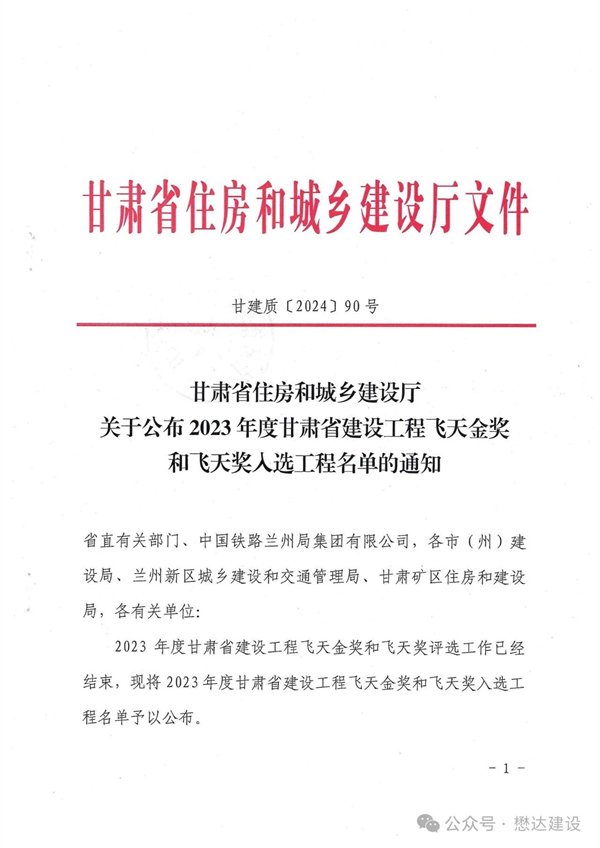甘肅省建設工程飛天獎(簡稱“飛天獎”)是甘肅省委、省政府批準的甘肅省工程建設領域質量最高獎項,獲獎工程質量應達到省內領先水平。